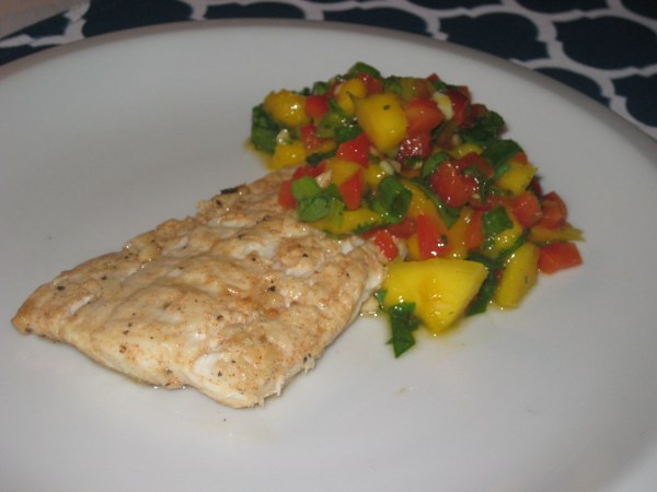 Coat fish with all ingredients in a shallow baking dish or bowl. Let marinate for 30 min to and hour. Heat your grill or grill pan to med-high and spray with cooking spray. If you are using a grill make sure to coat is well with spray or the fish will stick. Grill fillets for 4 min and each side until the fish starts to show grill marks. Serve with mango salsa and enjoy!