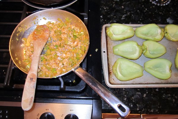 For crab stuffing heat 2 tablespoons olive oil in a large saucepan. Add onion, bell peppers and celery and cook until tender. Mix in a heaping tablespoon of Harold and Belle’s seasoning and then add shrimp and crab meat. Simmer stuffing at medium heat for 5 minutes stirring occasionally. Chop mirliton flesh that you saved earlier and add to stuffing mixture. Let simmer for 5 minutes. Add breadcrumbs and mix well. Remove from heat.